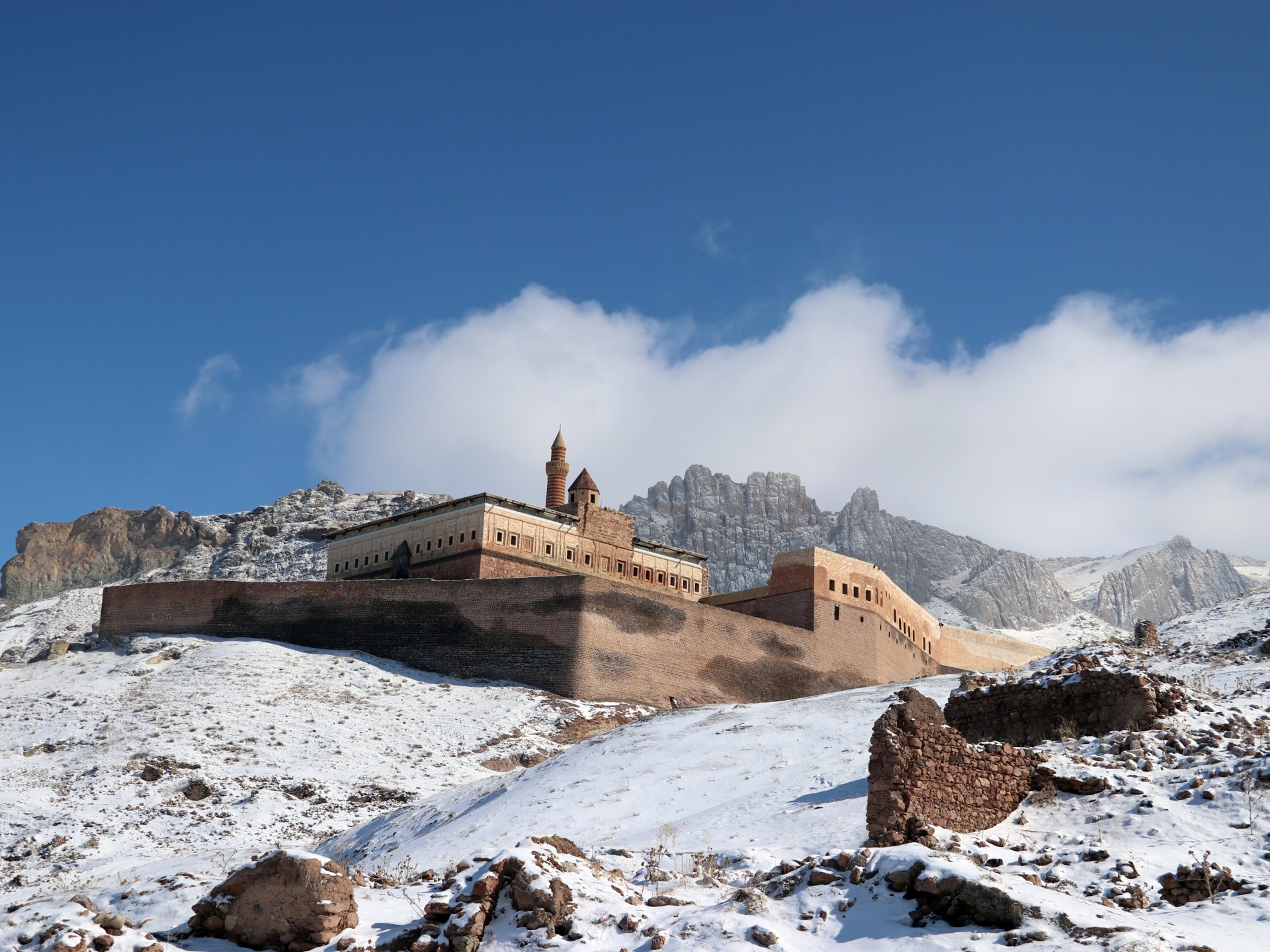 تُشكل مشاهد غروب الشمس في قصر إسحاق باشا، المحاط بالثلوج في قضاء “دوغو بيازيد” بولاية أغري شرقي تركيا، لوحة طبيعية ساحرة لمحبي التصوير الفوتوغرافي.