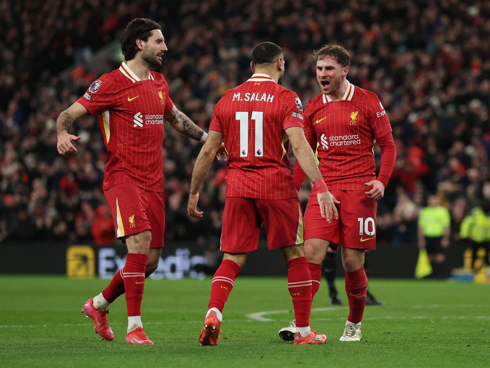 واحتفل المشجعون في أنفيلد بهدف ماك أليستر من خلال الهتاف “سنفوز بالدوري”، بينما توجهت كاميرات التلفزيون صوب سلوت الذي لوح من المدرجات بقبضتيه وهو في حالة سعادة.